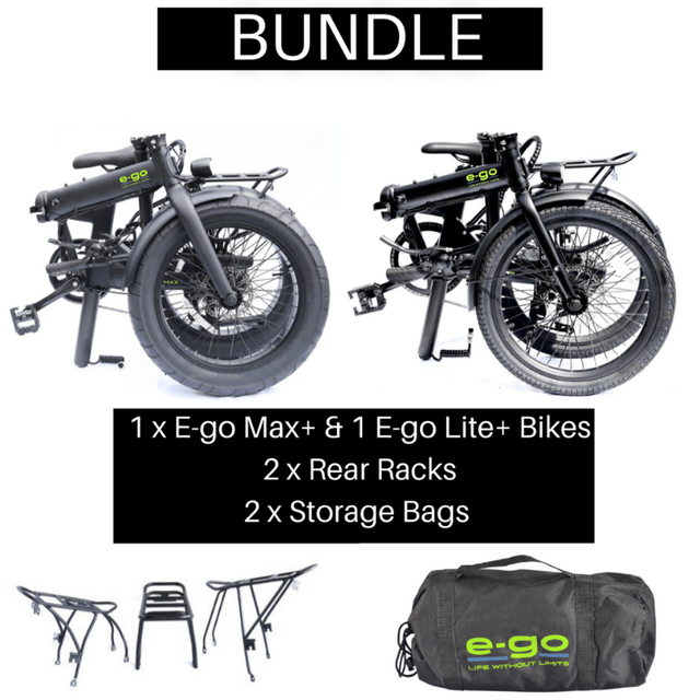 This bundle contains a Max and a Lite+ in your choice of colours plus 2 rear racks and 2 storage bags.